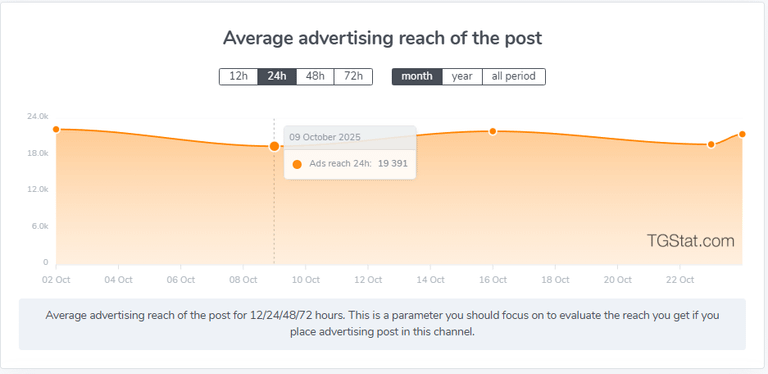 • Average advertising reach per post. Reflects the number of views within the channel itself, excluding reposts. Useful for an objective assessment of content placement effectiveness directly on the selected platform.