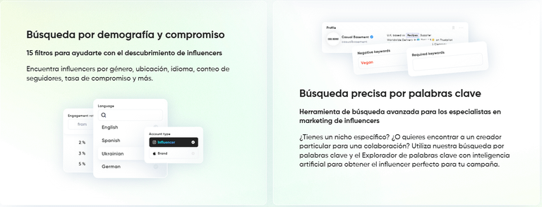 El método de búsqueda básico es la filtración por categorías. Durante la búsqueda, puede especificar intereses temáticos que se correspondan con la audiencia objetivo. Sin embargo, sin una configuración de filtros preliminar, existe el riesgo de obtener una lista de resultados demasiado amplia, ya que el sistema cubre cientos de millones de cuentas.